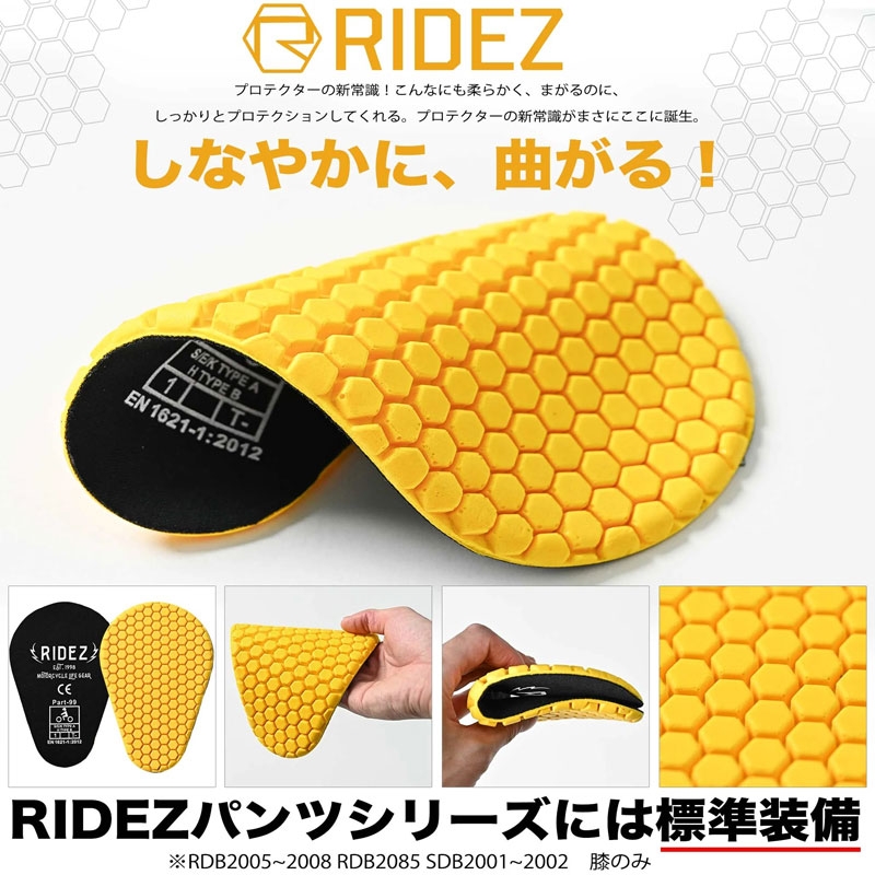 膝にはRIDEZオリジナルプロテクターを配置、CEレベル1の優れたプロテクターで膝を守ります。