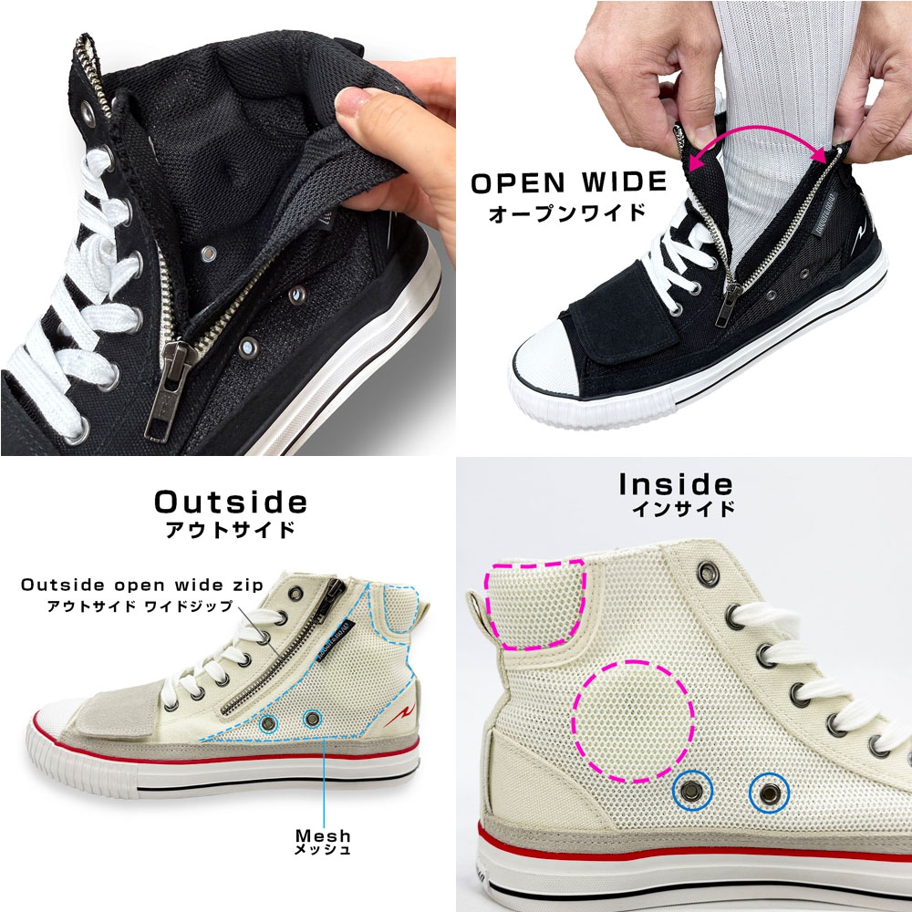 ツーリング等で名所・旧跡等も躊躇なく行けるさりげないデザインの、オンライドとオフライド仕様。メイン素材は、酷暑の夏でも涼しく快適なメッシュ素材採用。斜めに大きく開くファスナーは靴ひもをほどく必要がなく脱ぎ履きのしやすさが抜群です。しかも外側ファスナー仕様なので車体を傷つける心配がありません。踵にはリフレクターを装備し、視認性を確保。また、くるぶし内側に厚めのクッションを入れ車体をホールドしやすくしています。左足に装備した大きめのシフトガードは、幅5.5センチとシフト場所の個人差にも余裕で対応。また表面に凹凸のある立体カップインソールを採用し、通気性とクッション性を高め快適さが向上。