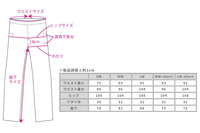 - SW(26-32)・MW(30-36)・LW(34-40)・MW-short(30-36/股下70-76cm)・LW-short(34-40/股下73-79cm)