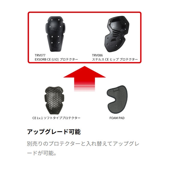 標準装備のフォームタイプのヒッププロテクターは、別売りのTRV086ステルス CE ヒッププロテクターにてアップグレードが可能です。