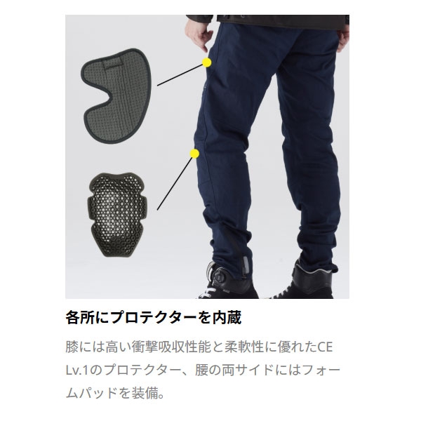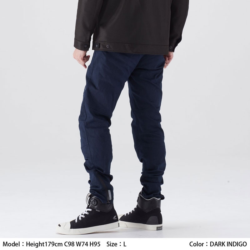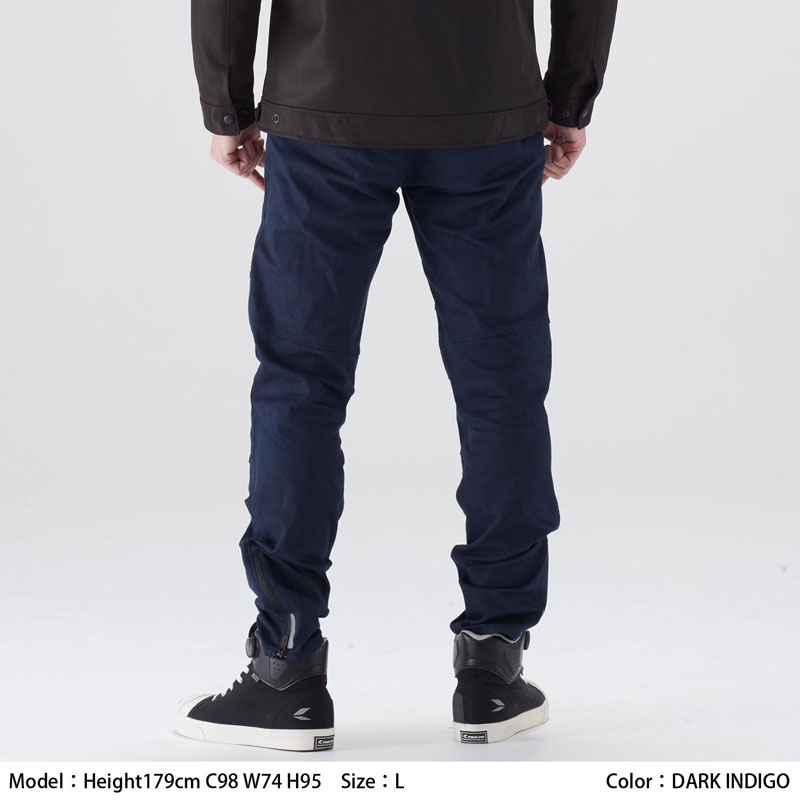 CORDURA®混紡生地を使用したデニムスタイルのライディングパンツ。