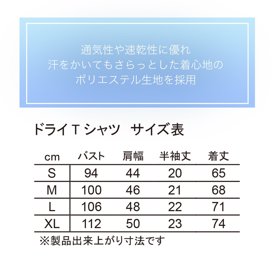 通気性や速乾性に優れ、汗をかいてもさらっとした着心地のポリエステル生地を採用。