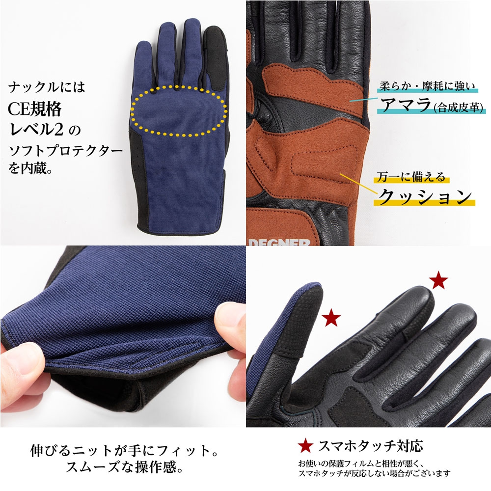 スマホ対応、夜に光るリフレクターロゴ入りと、バイカー目線のこだわりを詰め込んだグローブ。
