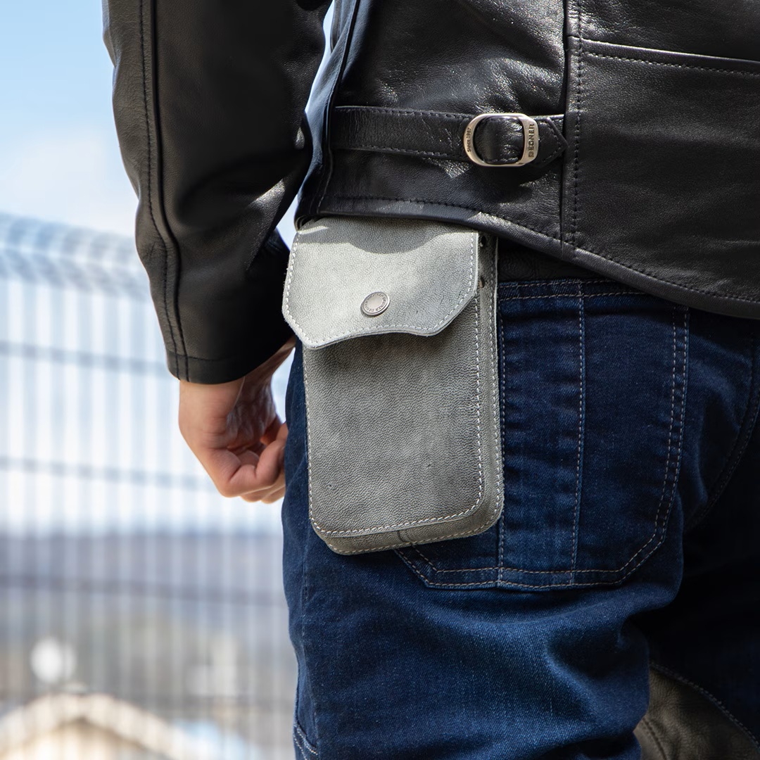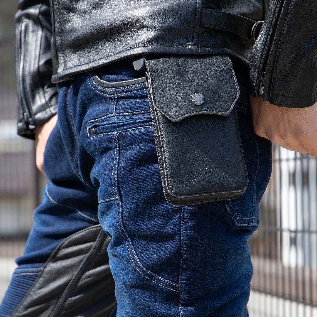 パンツのポケットに入れず、ケースに入れてボタンを留めることでスマートフォンの落下を防ぎます。