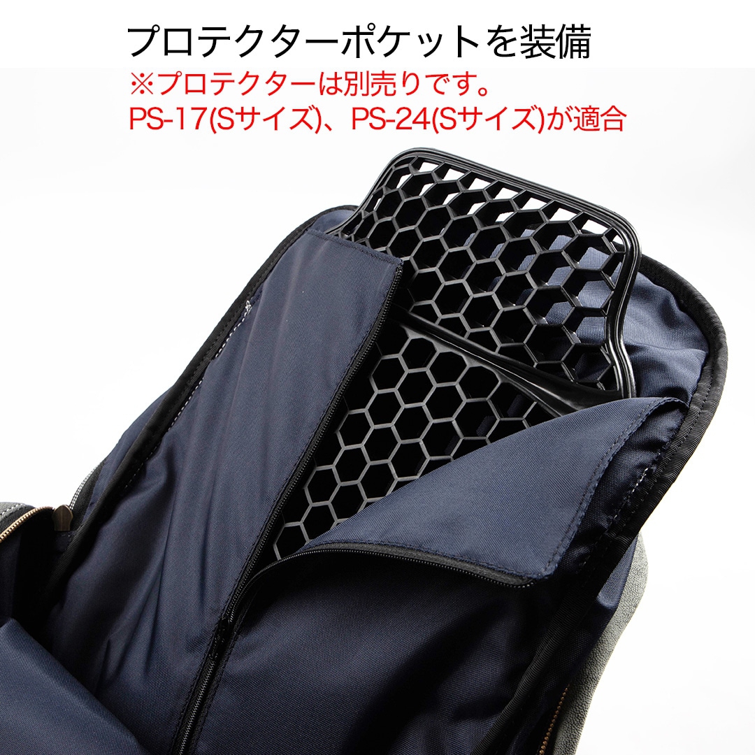 バッグの背中側には、プロテクターポケットを装備することができる。