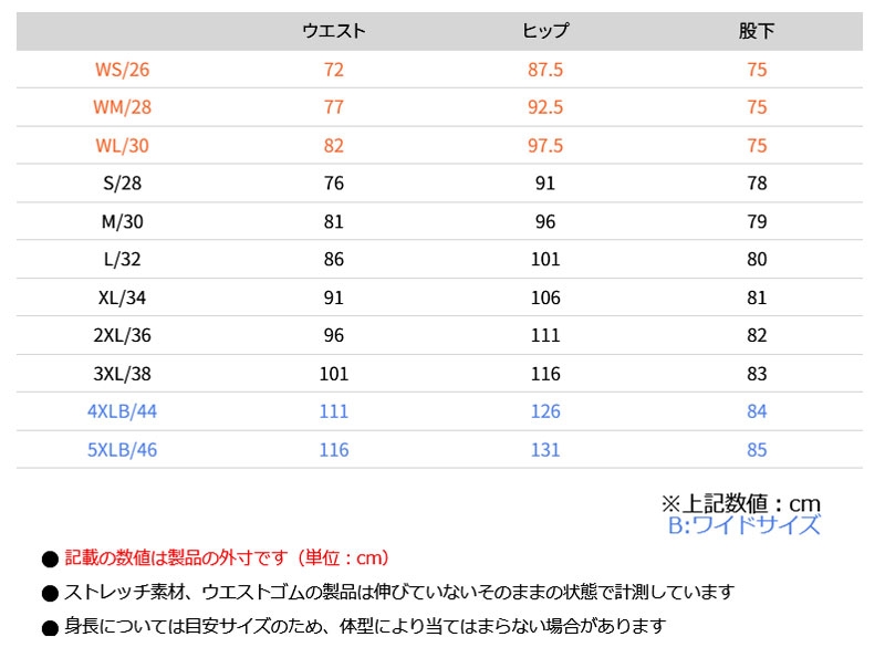 - S/28・M/30・L/32・XL/34・2XL/36・3XL/38・4XL/44・5XLB/46